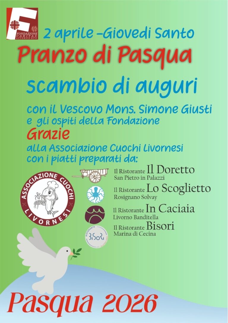 Ultime News 2 Aprile, Giovedì Santo, con il Vescovo Simone in preghiera, scambio di auguri e pranzo con ospiti (clicca&leggi) 15 Marzo, Domenica della Quaresima di Carità, raccolta di denaro nelle parrocchie per la realizzazione dell’Atelier vintage “Perseguitati ma non Abbandonati”: Via Crucis Venerdì 6 Marzo h 11.00 Presieduta dal Vescovo Simone (clicca&leggi) Le Parole della Quaresima Carità 2026 (clicca&leggi) AAA.: ULTIMI GIORNI per Bando Servizio civile universale, scadenza domanda h 14.00 di Mercoledì 8 Aprile, in Caritas Livorno selezione per 14 volontari (clicca&Leggi) Nominato dal Vescovo Simone il Presidente e Consiglio di Amministrazione (clicca&leggi) archivio news eventicaritas italianacaritas livornodonazionivolontariato 2 Aprile, Giovedì Santo, con il Vescovo Simone in preghiera, scambio di auguri e pranzo con ospiti (clicca&leggi) AAA.: ULTIMI GIORNI per Bando Servizio civile universale, scadenza domanda h 14.00 di Mercoledì 8 Aprile, in Caritas Livorno selezione per 14 volontari (clicca&Leggi) Nominato dal Vescovo Simone il Presidente e Consiglio di Amministrazione (clicca&leggi) Mercoledì delle Ceneri 18 Febbraio, Celebrazione in Fondazione (clicca&leggi) archivio eventi AAA.: ULTIMI GIORNI per Bando Servizio civile universale, scadenza domanda h 14.00 di Mercoledì 8 Aprile, in Caritas Livorno selezione per 14 volontari (clicca&Leggi) Caritas italiana: materiali per la Quaresima (cliccaLeggi&Scarica) Lunedì 23 Febbraio h 15.15 su TV2000 presentazione del volume “Il paradigma della giustizia riparativa. Un cammino per le comunità cristiane”, a cura di Caritas italiana (clicca&Leggi) Educazione finanziaria, inclusione, solidarietà – incontri online 21, 29 Gennaio e 11 Febbraio (clicca&leggi) archivio 15 Marzo, Domenica della Quaresima di Carità, raccolta di denaro nelle parrocchie per la realizzazione dell’Atelier vintage “Perseguitati ma non Abbandonati”: Via Crucis Venerdì 6 Marzo h 11.00 Presieduta dal Vescovo Simone (clicca&leggi) Le Parole della Quaresima Carità 2026 (clicca&leggi) AAA.: ULTIMI GIORNI per Bando Servizio civile universale, scadenza domanda h 14.00 di Mercoledì 8 Aprile, in Caritas Livorno selezione per 14 volontari (clicca&Leggi) archivio Al Villaggio della Carità I Lions Club cittadini (clicca&leggi) Grazie di cuore a Fondazione Intesa Sanpaolo Delegazione regionale di Sovvenire in visita (clicca&leggi) 5×1000 alla Fondazione Caritas Livorno: 1Dono con 1Firma (clicca&leggi). Grazie! archivio AAA.: ULTIMI GIORNI per Bando Servizio civile universale, scadenza domanda h 14.00 di Mercoledì 8 Aprile, in Caritas Livorno selezione per 14 volontari (clicca&Leggi) Formazione giovani: Scuola&Volontariato (clicca&leggi) Un grazie reciproco ai giovani che hanno terminato l’anno di Servizio civile (clicca&leggi) Benvenuti giovani che da Mercoledì 28 Maggio iniziate il Servizio civile (clicca&leggi) archivio